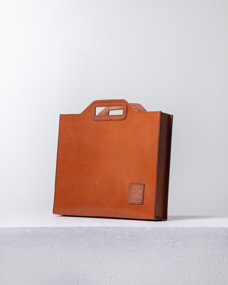 Briefcase bag in natural/black color. Minimal design without lining and interior pockets. Hand-stitched around the perimeter with waxed thread. Sole leather lining on the bottom for further reinforcement.